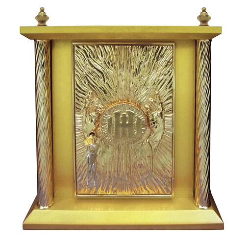 Tabernakulum wykonane z drewna, wykończone powłoką w kolorze złota.