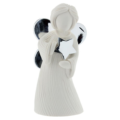 Figurka anioła nowoczesna, biała, z gwiazdą i skrzydłami srebrnyi - 12 cm