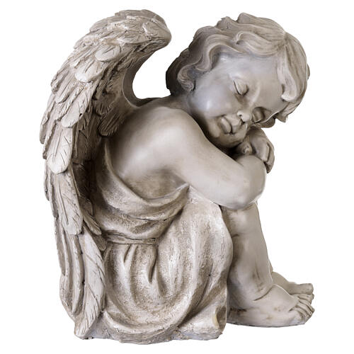 Figura anioła - cherubin siedzący, z efektem jasnego kamienia, do użytku zewnętrznego, 35 cm.