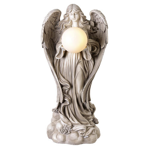 Dekoracyjna figura przedstawiająca stojącego anioła trzymającego przed sobą kulę świetlną. Motyw łączy symbolikę opieki i pamięci z delikatnym oświetleniem, tworząc nastrojowy akcent w przestrzeni zewnętrznej.