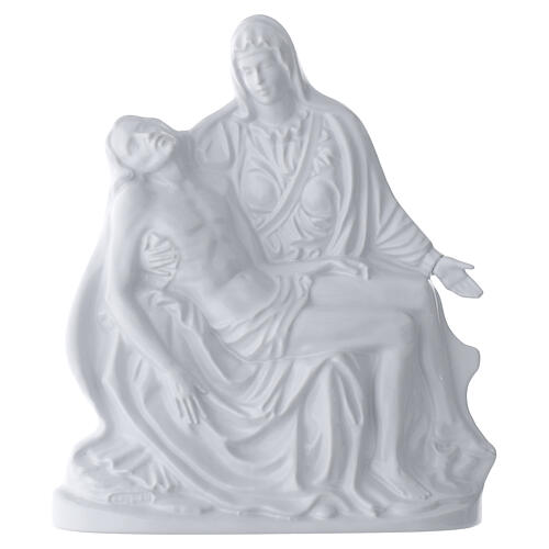 Tablica aplikacyjna do montażu ściennego w formie płaskorzeźby, przedstawiająca Pietę inspirowaną słynnym dziełem Michała Anioła – Matkę Bożą siedzącą, podtrzymującą ciało Jezusa Chrystusa. Produkt wykonany z jednolitym białym wykończeniem i wyraźnie opracowanym modelunkiem form.