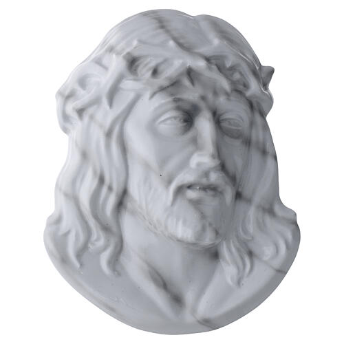 Tablica aplikacyjna do montażu ściennego w formie płaskorzeźby, przedstawiająca twarz Jezusa Chrystusa, wykonana z wykończeniem imitującym marmur Carrara.