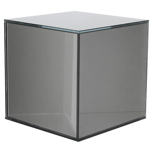 Szklana urna na prochy o szarym wykończeniu, w formie sześcianu (20 cm).