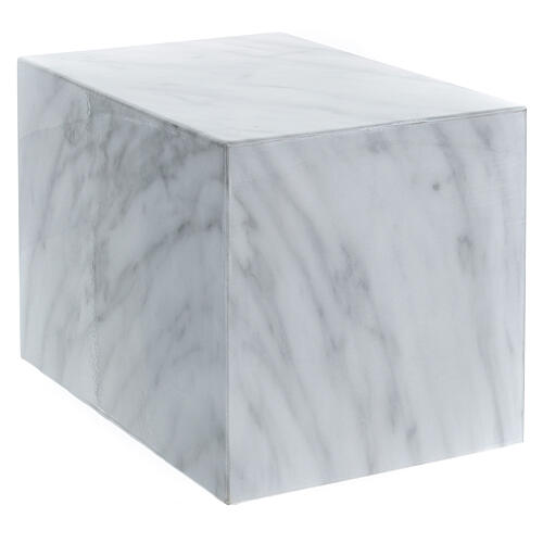 Prostopadłościenna urna kremacyjna o pojemności 5 litrów, z gładką powierzchnią i błyszczącym wykończeniem imitującym marmur Carrara.
