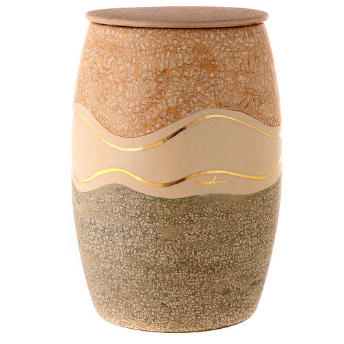 Urna została uformowana na kole garncarskim i wypalana w trzech etapach (1000°C, 900°C oraz 750°C), co zapewnia trwałość i głębię kolorów. Marmurkowe wykończenie w odcieniach kremu, zieleni i pomarańczu zostało dodatkowo podkreślone złotym, falistym motywem dekoracyjnym, nadającym całości szlachetny charakter.