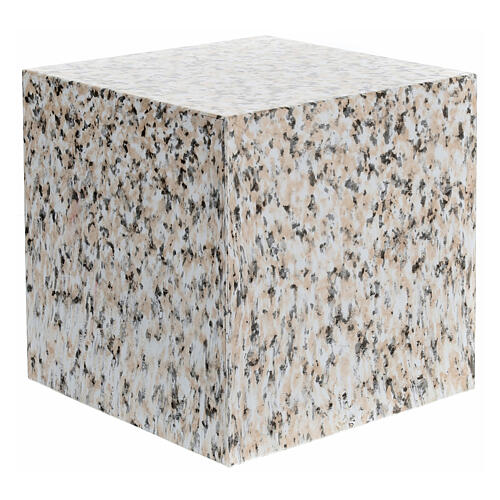 Urna na prochy w kształcie sześcianu, ozdobiona efektem polerowanego granitu.