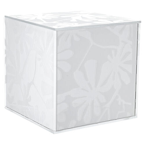 Urna na prochy ze szkła, biała z motywem kwiatowym, 20 cm