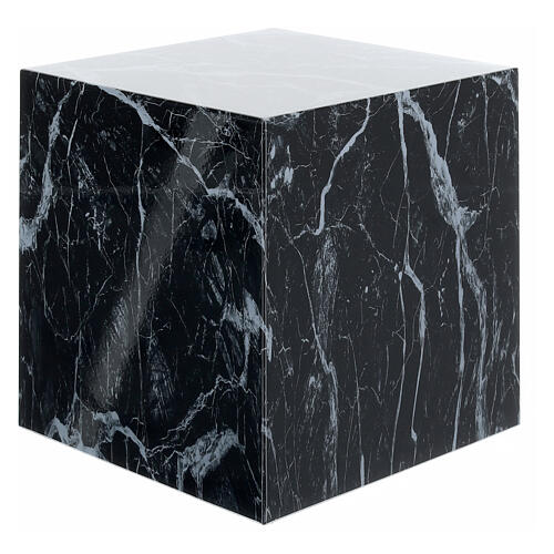 Urna pogrzebowa o sześciennej, gładkiej formie i z efektem czarnego marmuru i błyszczącym wykończeniem.