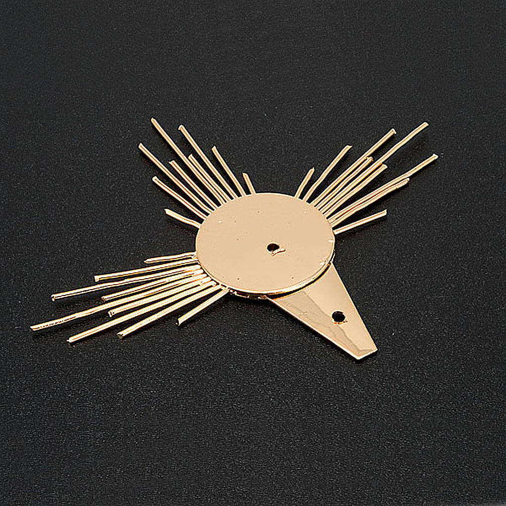 Ta promienista aureola została w całości ręcznie wykonana i wykończona z dbałością o każdy szczegół. Jej forma przypomina promienie: są to 3 wiązki promieni wychodzących z centralnego dysku.