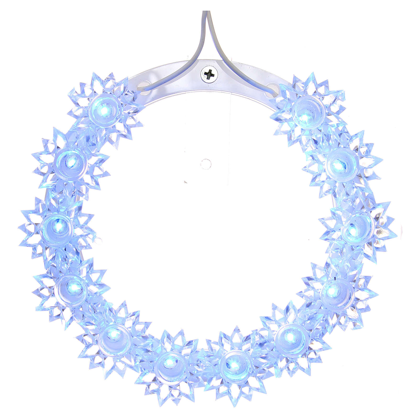 Aureola podświetlana do figurek sakralnych w kształcie okręgu, zdobiona 12 kwiatami, które świecą się za pomocą niebieskich led umieszczonych w ich wnętrzu.