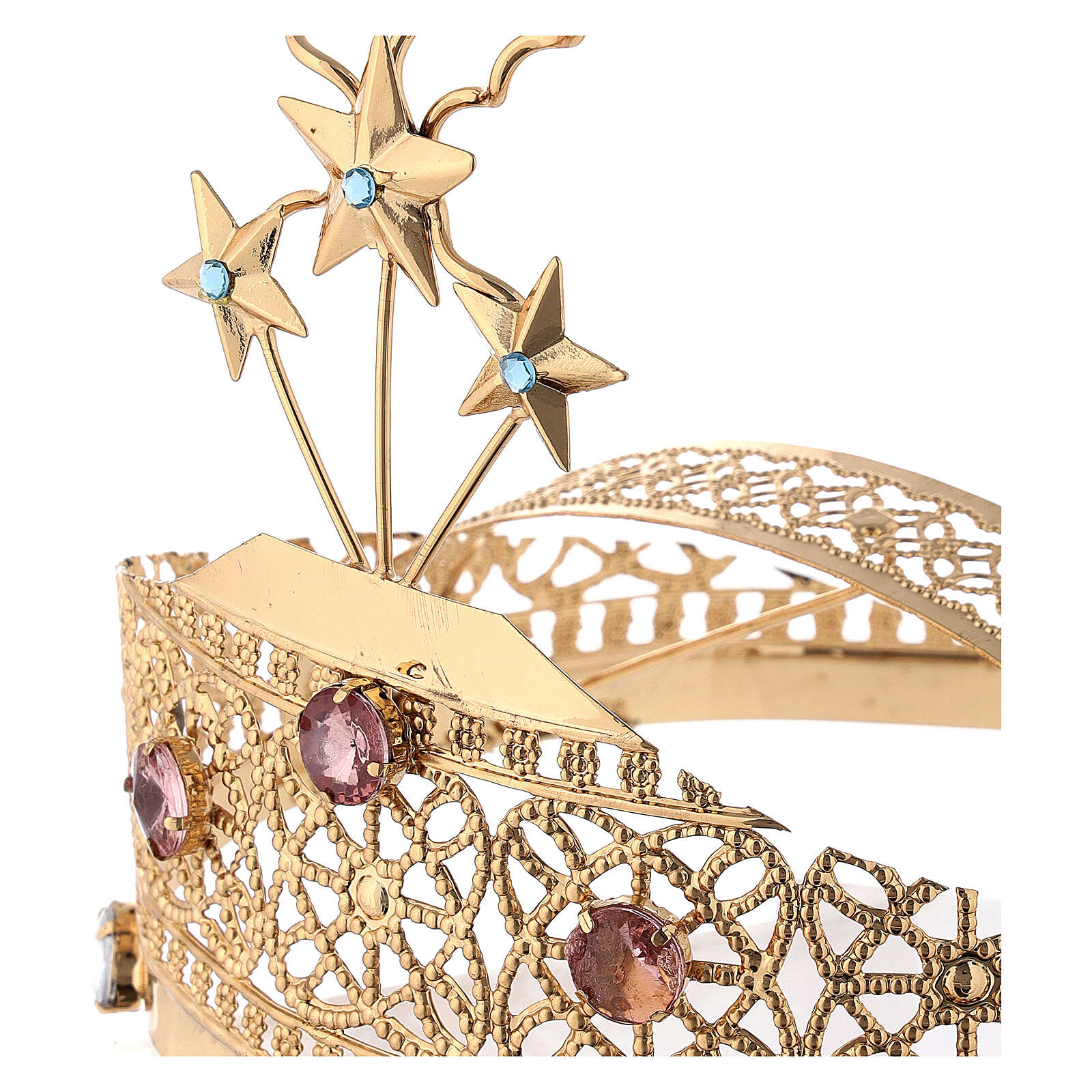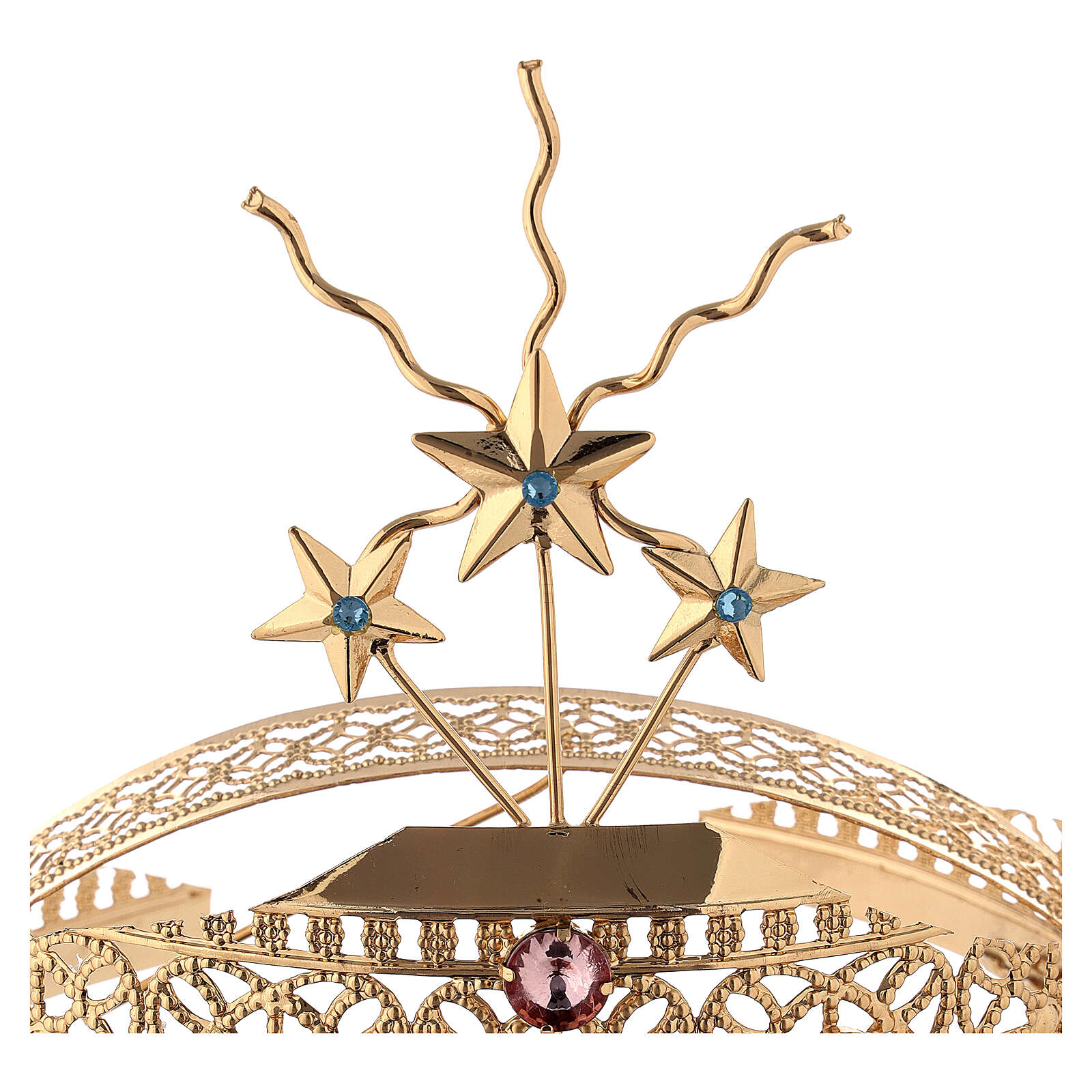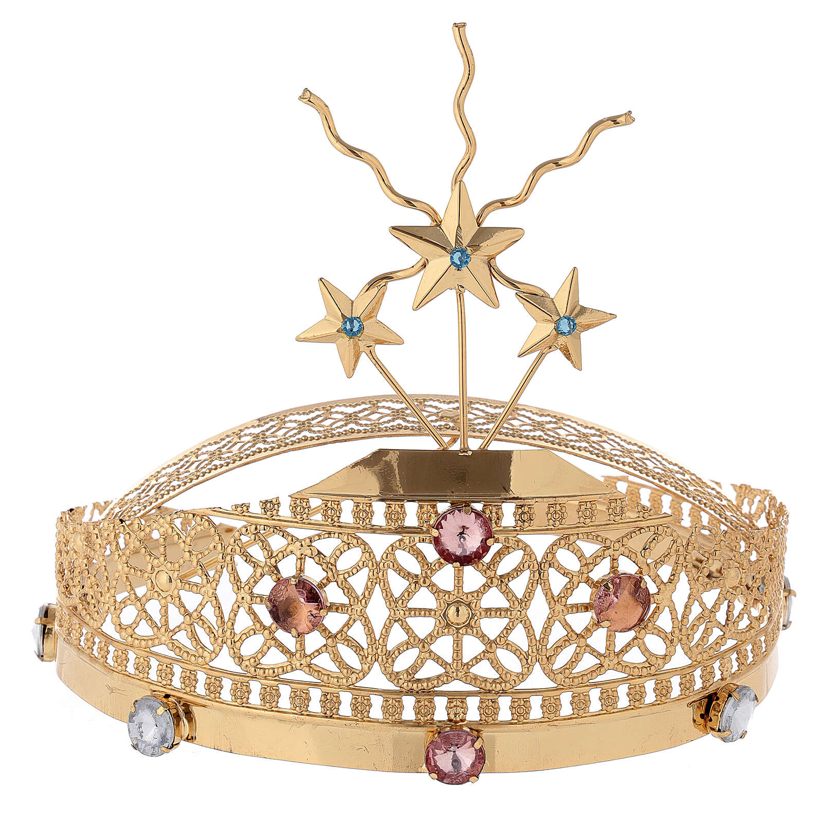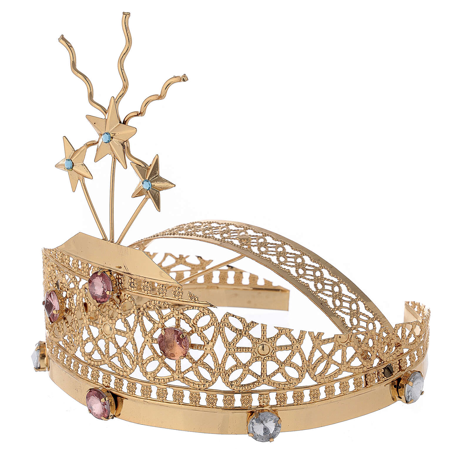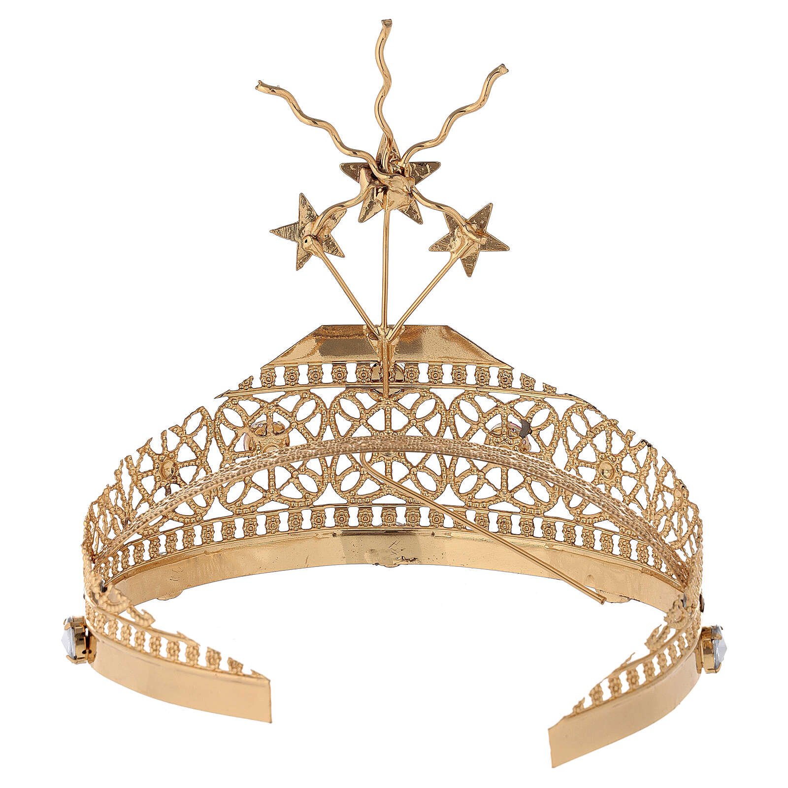 Diadem do figur z mosiądzu ze złoconym filigranem i kolorowym strassem.