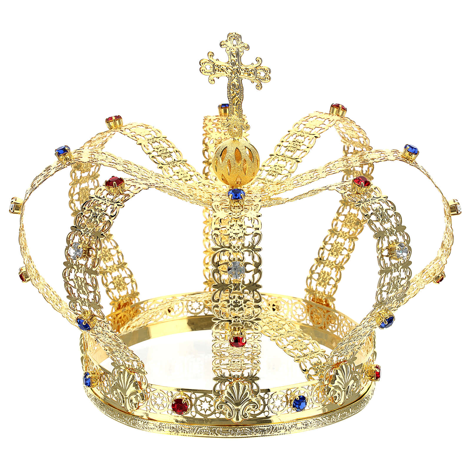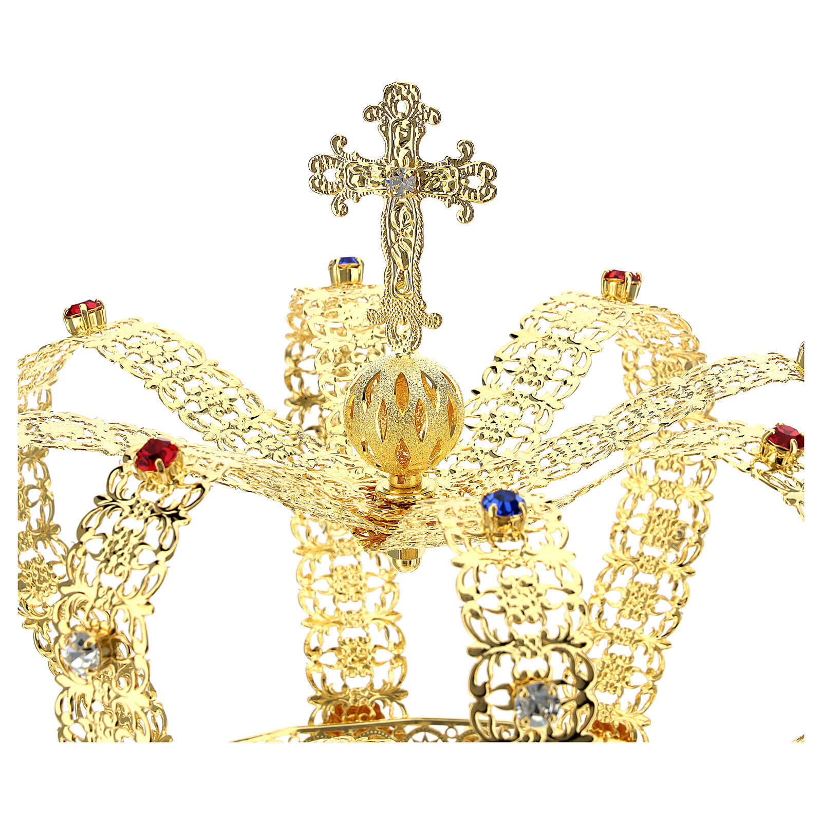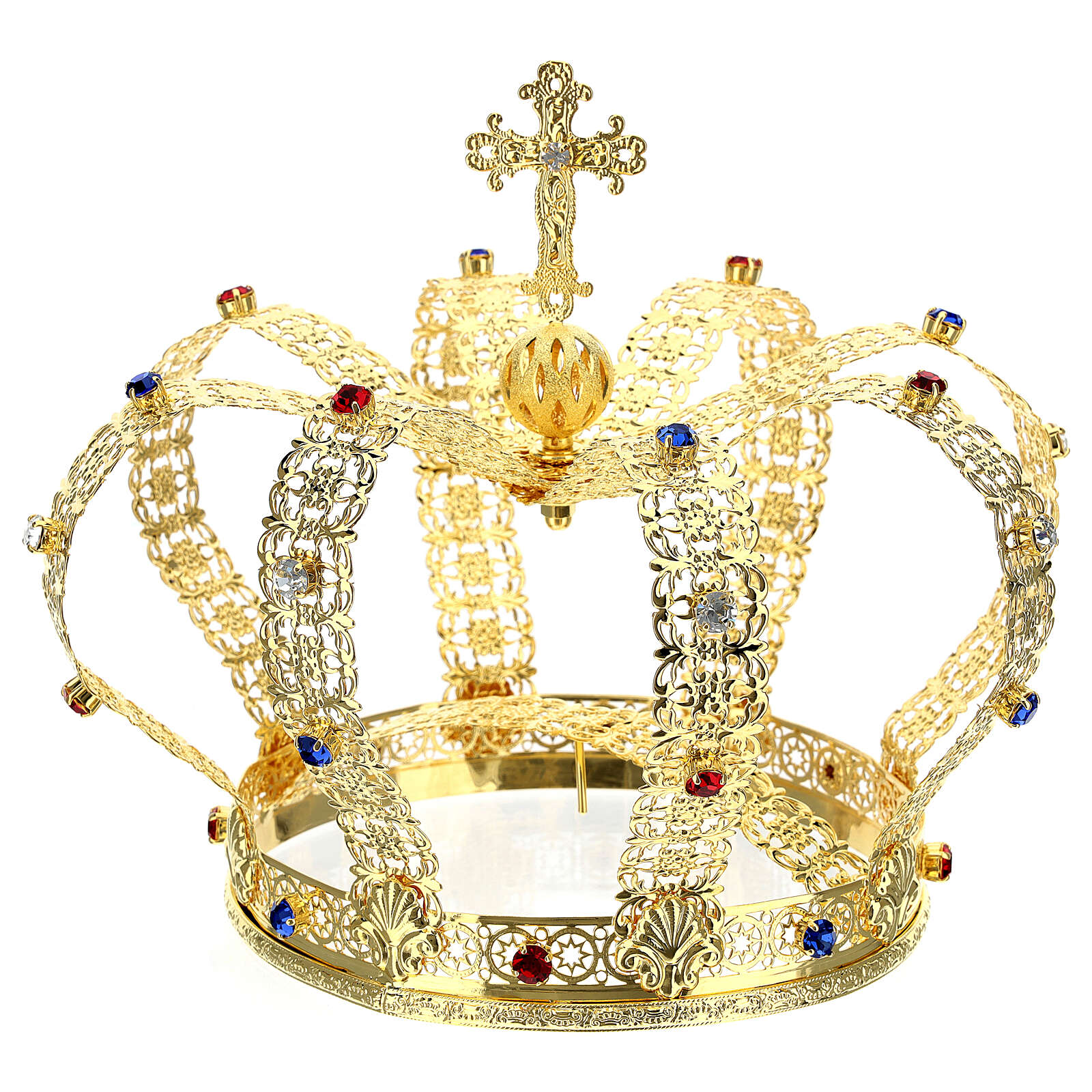 Korona w stylu cesarskim pozłacana, z krzyżem składanym na czubku i białymi klejnotami.