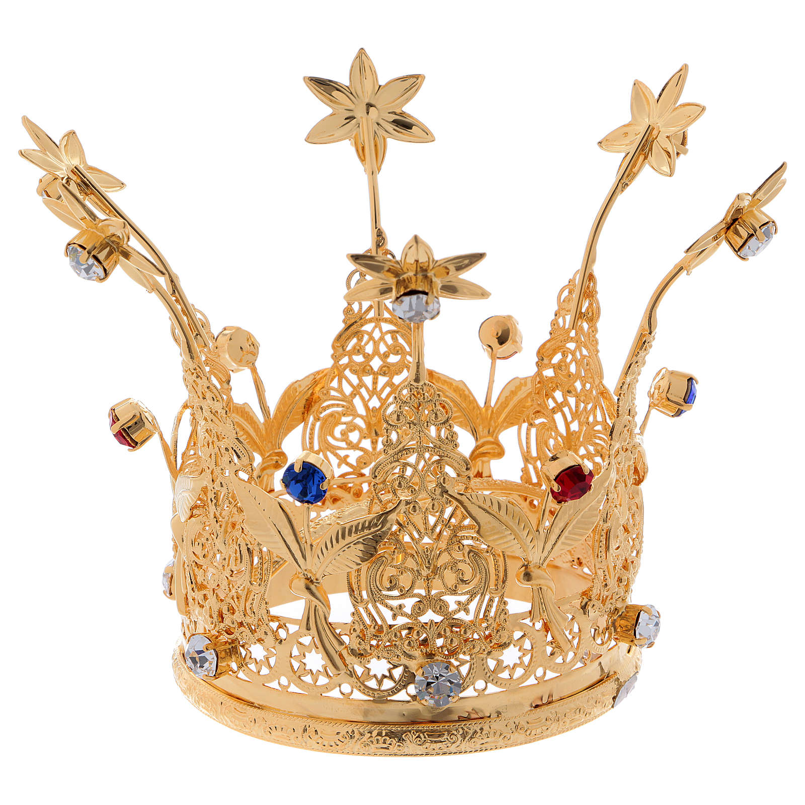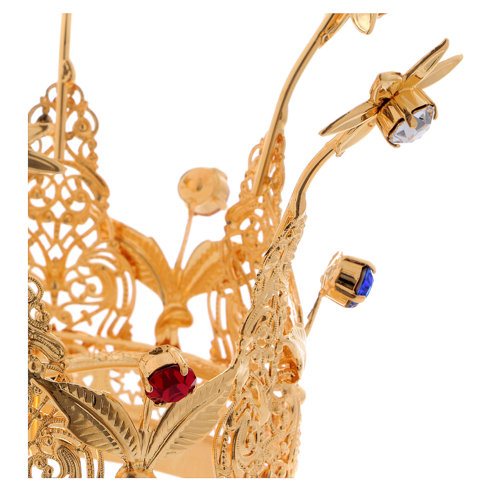 Korona w stylu królewskim, z efektem filigranu i z kamieniami czerwonymi, białymi i niebieskimi.