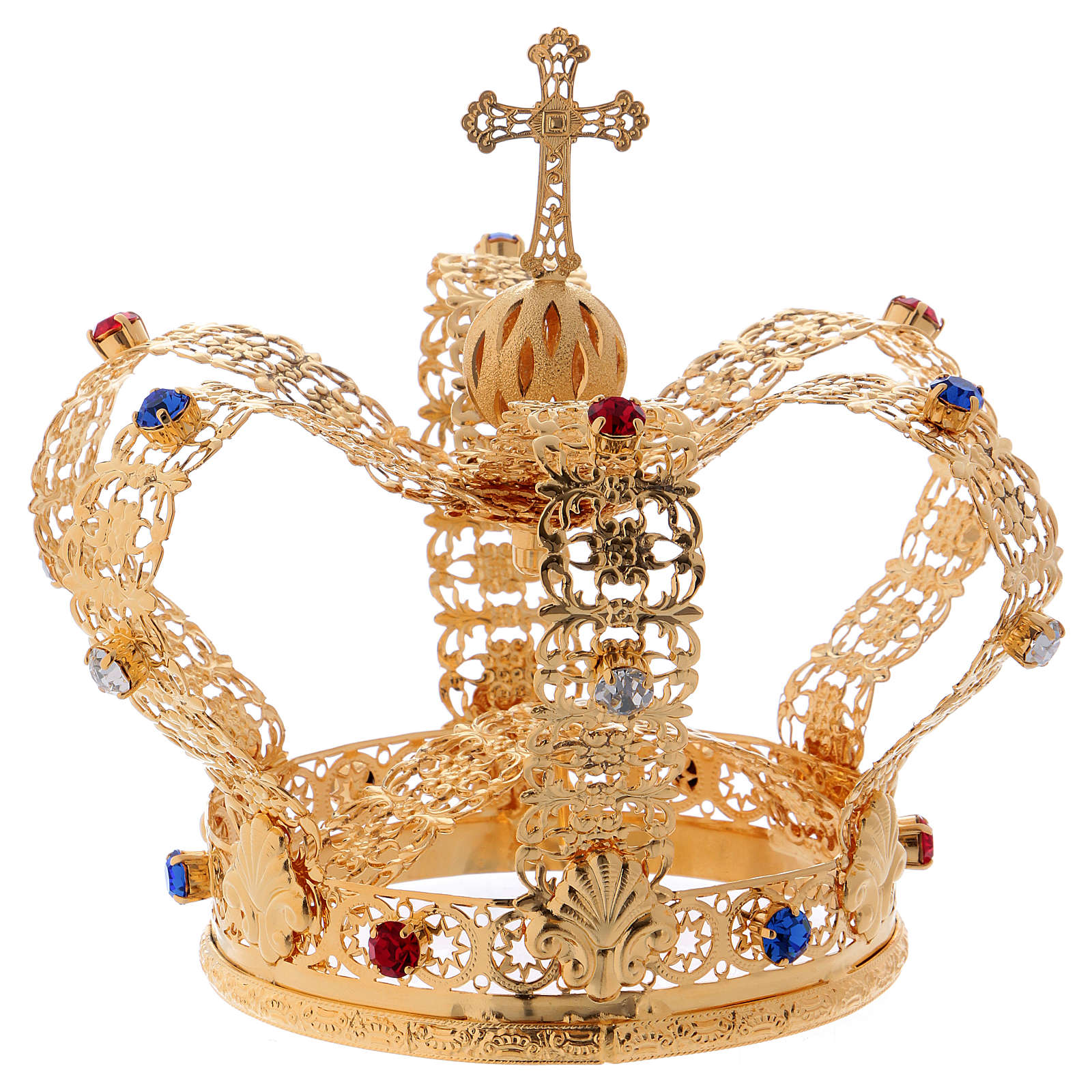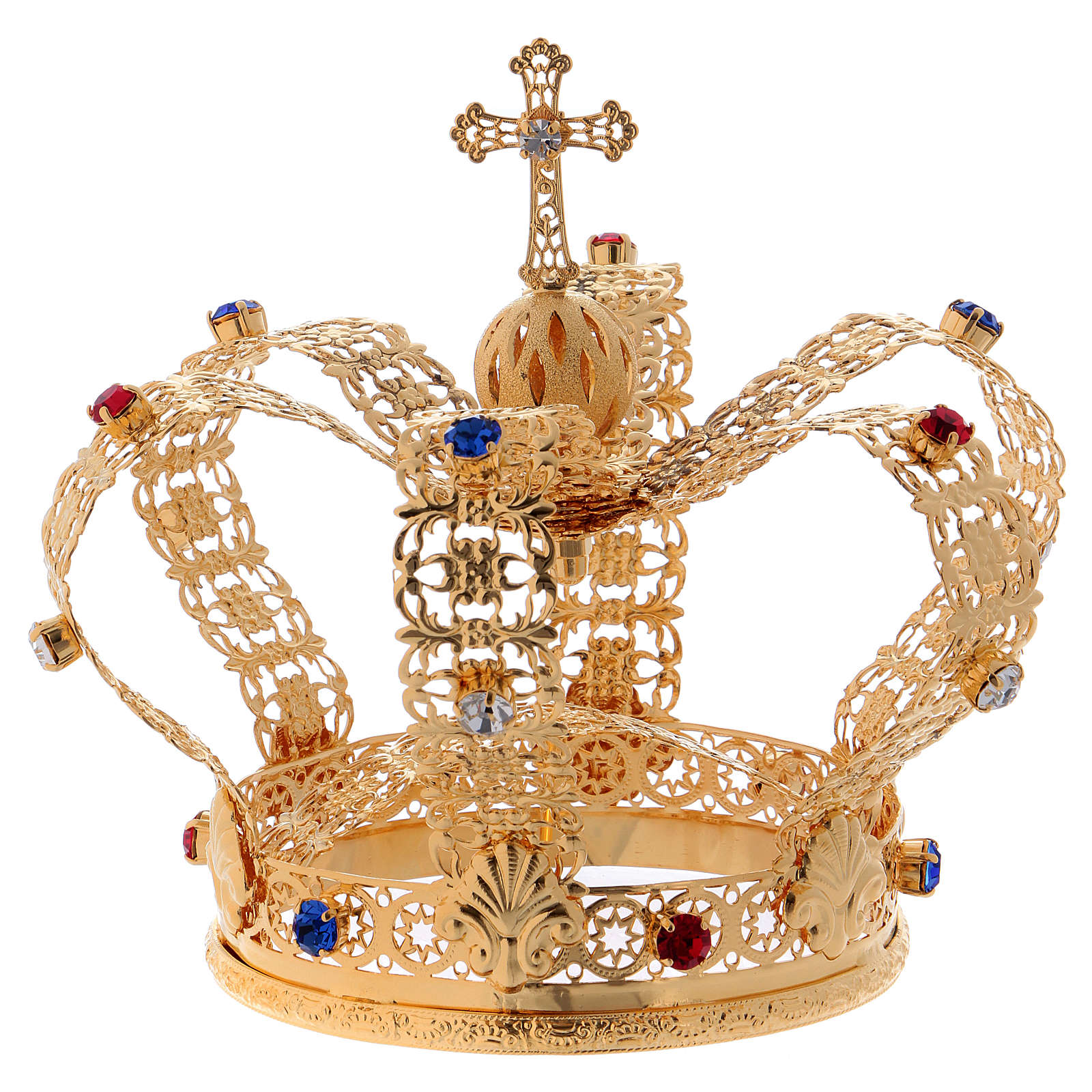 Korona pozłacana z krzyżem na stałe przymocowanym do czubka, ubogacona szczególnymi nacięciami i dekoracjami oraz kamieniami w czerwonym i niebieskim kolorze.