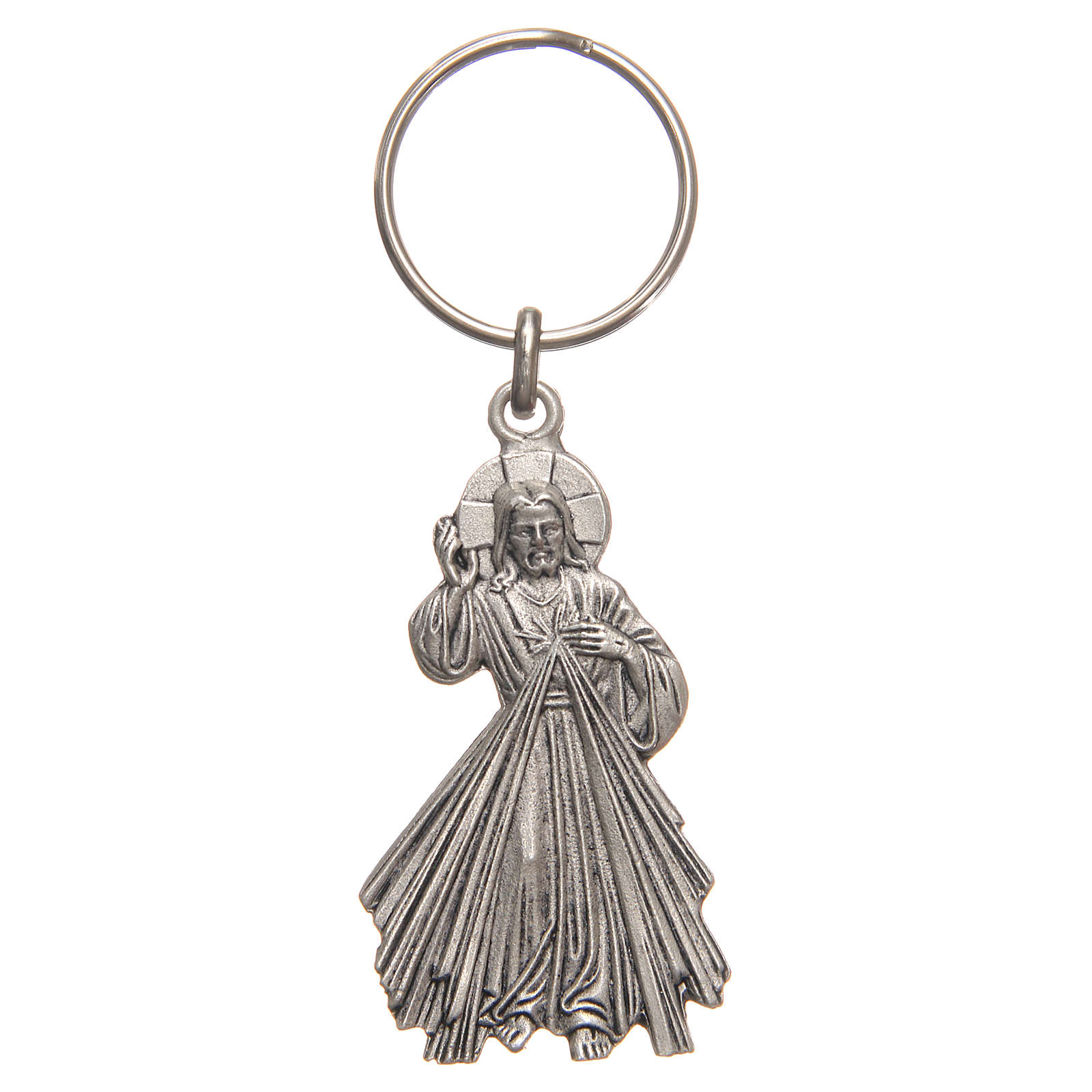Brelok wykonany z galwanizowanego srebra przedstawiający Jezusa Miłosiernego.