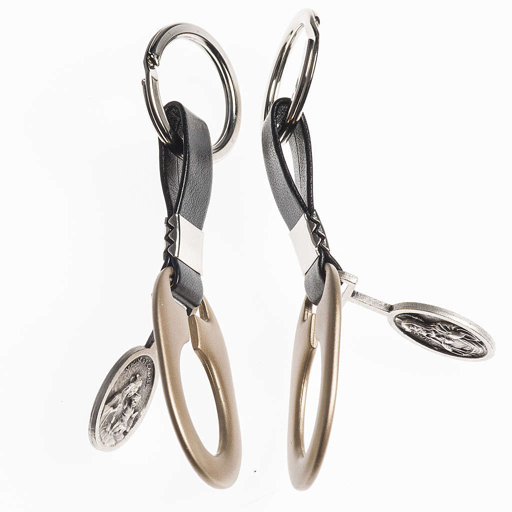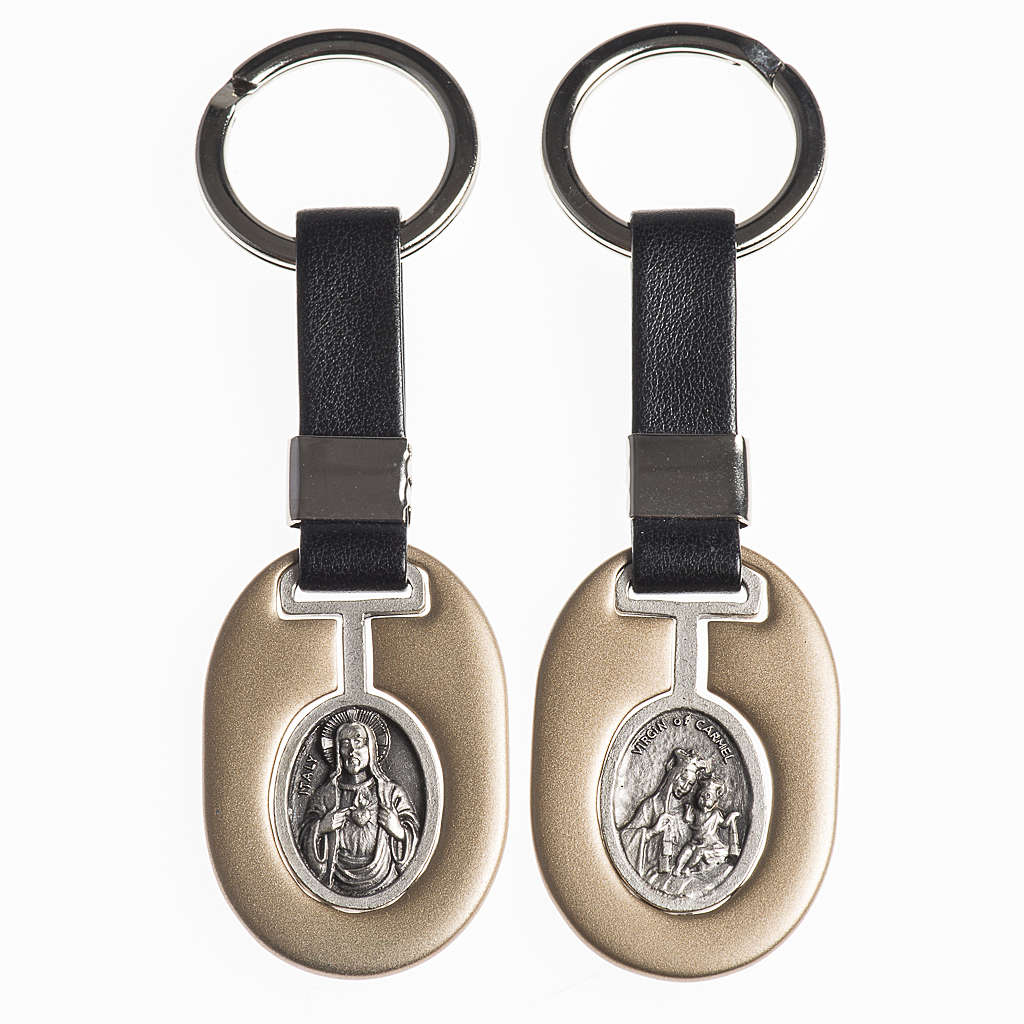 Brelok wykonany z metalu z dwoma obrazkami: święte Serce Jezusa lub Matka Boska Carmel.