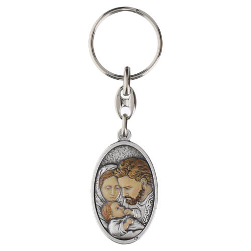 Brelok z owalnym medalikiem przedstawiającym kolorowy wizerunek Świętej Rodziny na awersie oraz wypukłe przedstawienie Ducha Świętego na rewersie.