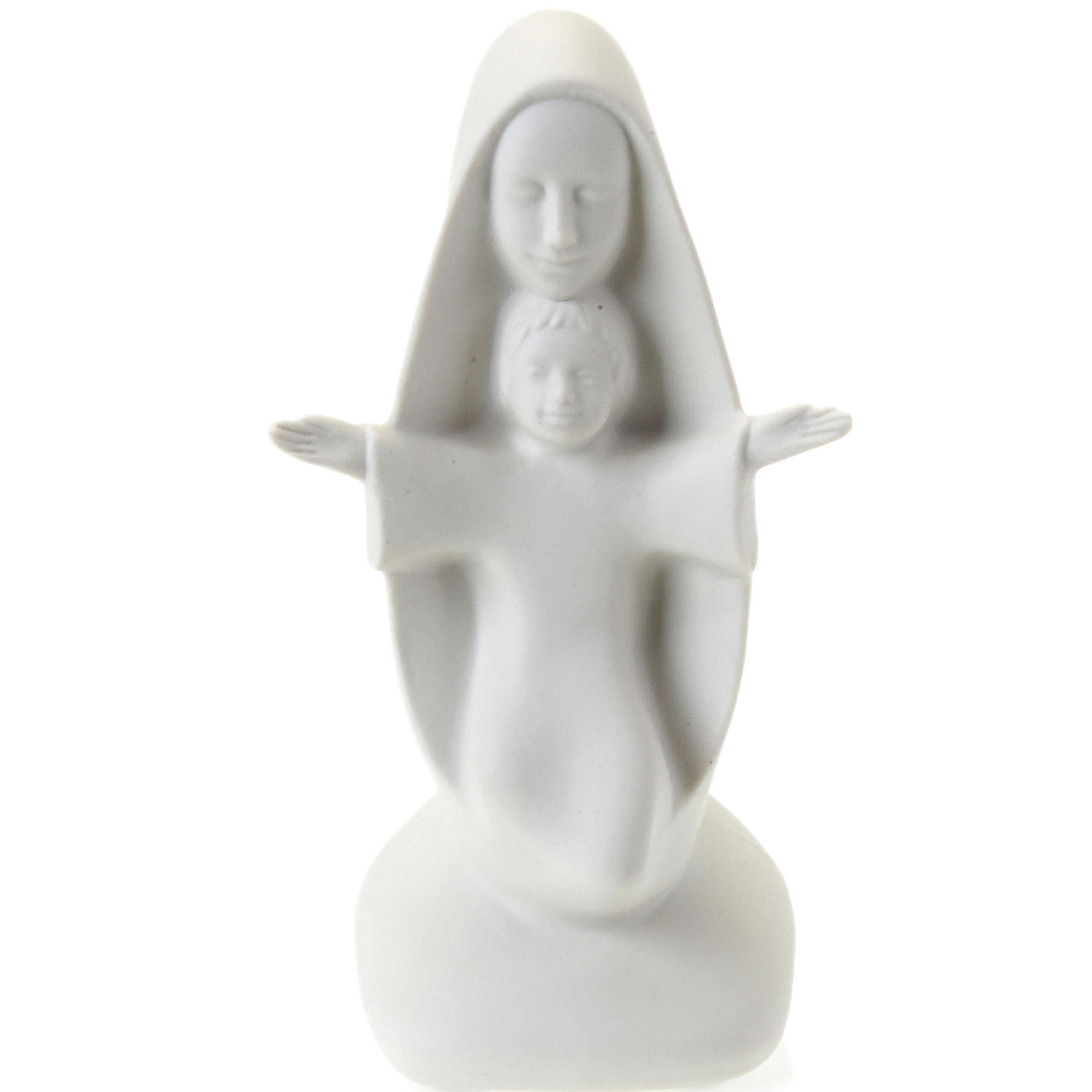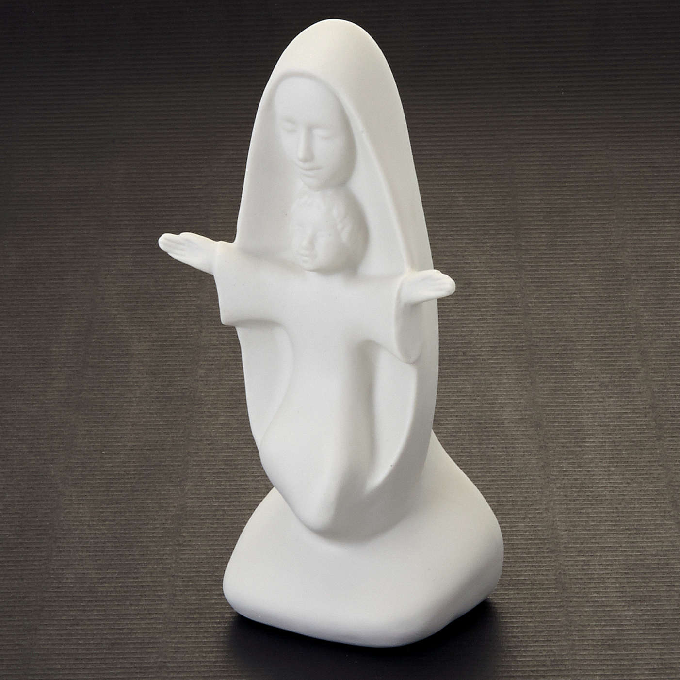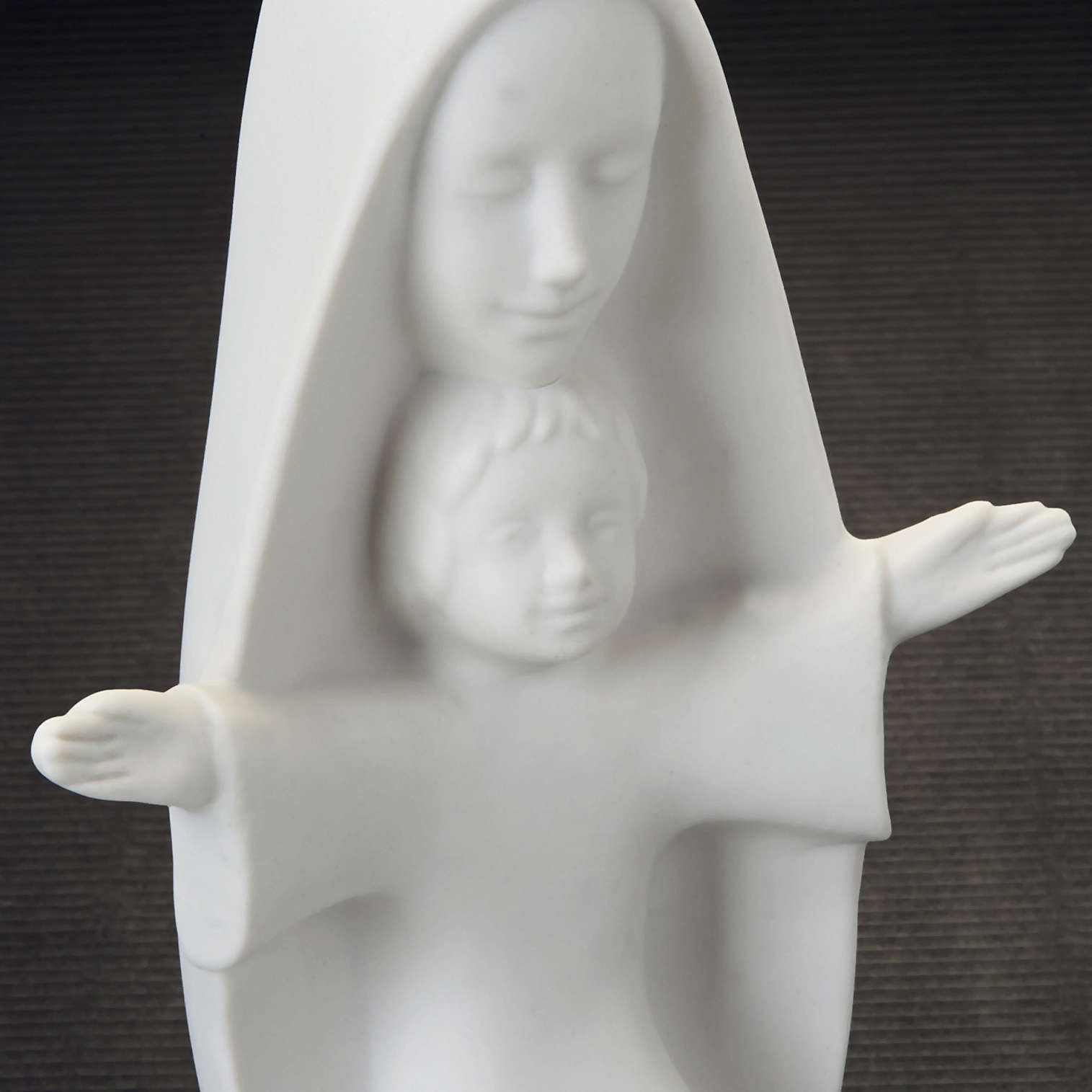Popiersie Matka Boża z Dzieciątkiem. Otwarte ramiona ukrytego pod płaszczem Madonny Dzieciątka Jezusa oraz jego szaty przypominają kształtem krzyż. Delikatne i proste kształty tej figurki sprawiają, że nadaje się ona do każdego wnętrza.