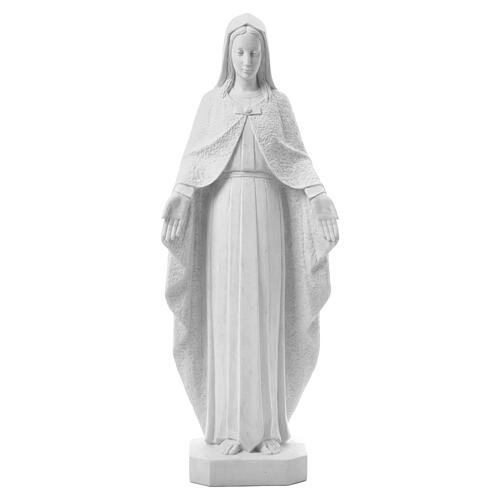 Matka Boża z otwartymi ramionami figurka sakralna szczegółowo wykończona: twarz, szaty i włosy są wykonane z wielką troską o każdy detal. Tą figurkę cechuje wysoka jakość i duża odporność. Można ją wystawić na zewnątrz, ponieważ została zrealizowana z proszku marmurowego z Carrary (Włochy) i żywicy.