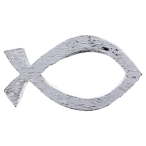 Ichthys (symbol ryby chrześcijańskiej) wykonany z żywicy z błyszczącą, chromowaną powłoką i metalicznym, teksturowanym wykończeniem. Stylizowany profil odzwierciedla kształt chrześcijańskiej ryby: ciągła linia o zaokrąglonym konturze z nieregularnymi nacięciami na całej widocznej powierzchni, które podkreślają ręczne opracowanie.