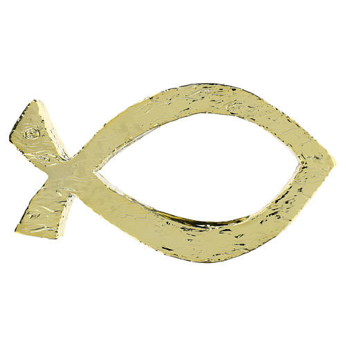 Ichthys z żywicy, złote, teksturowane wykończenie, 10,5×19×3 cm.