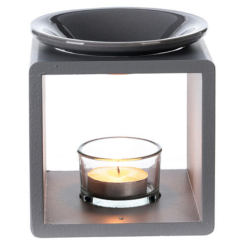 Kominek do olejków zapachowych, wykonany z ceramiki w kształcie kostki w szarym kolorze i o prostych liniach.