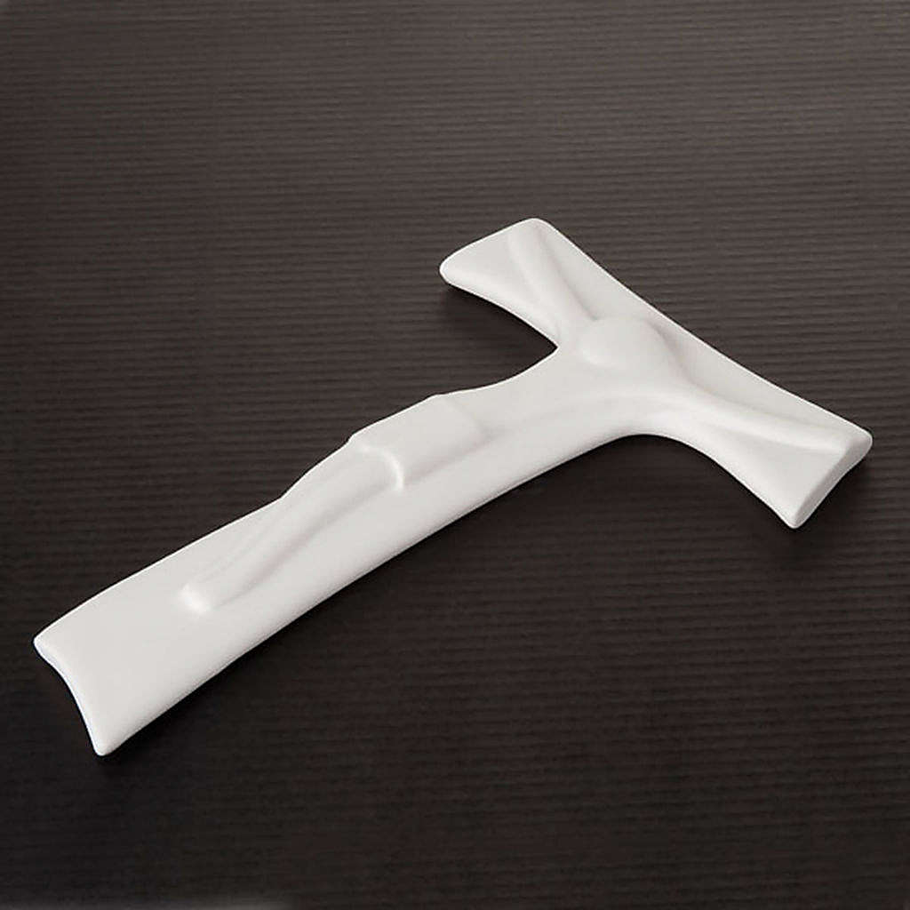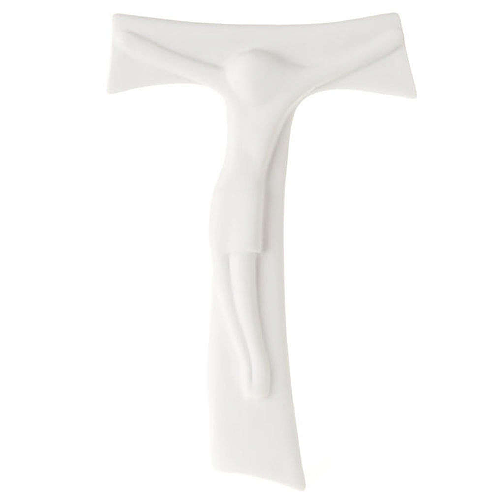 Krucyfiks Tau z białej procelany z ciałem Chrystusa. Krucyfiks jest zrobiony w stylu nowoczesnym. Wykonany ręcznie przez włoskiego artystę.