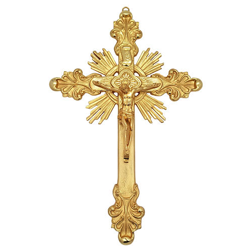 Wykonany z mosiądzu z galwanicznym złoceniem, posiada centralną promienistą aureolę oraz nałożoną figurę Chrystusa.