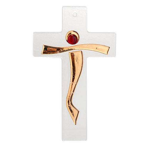 Szkło z jakiego jest zrobiony krucyfiks pochodzi z Murano, jest to szkło wysokiej jakości. Krzyż może być zawieszony na ścianie.