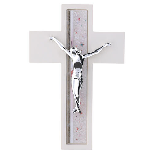 Krzyż biały z różowym szkłem Murano i srebrzonym Chrystusem, 25,5×14,5 cm.