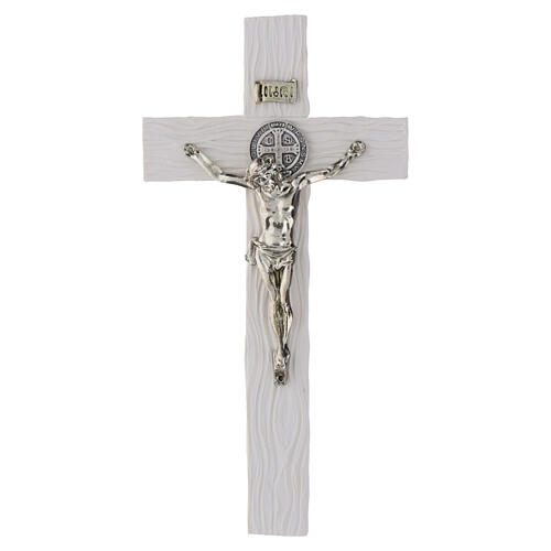 Krzyż św. Benedykta z białej żywicy, z postacią Ukrzyżowanego i medalikiem w metalowym, srebrnym wykończeniu.