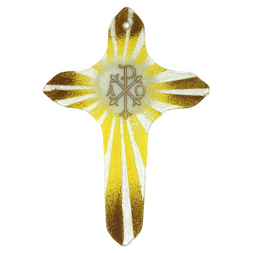Ręcznie wykonany żółty krzyż sakralny z autentycznego szkła Murano, z centralnym złotym symbolem PAX oraz literami Alfa i Omega, wyobrażającymi wieczną boskość Chrystusa.