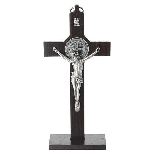 Krucyfiks z drewna mahoniowego z wizerunkiem Chrystusa oraz medalem św. Benedykta z mosiądzu, posrebrzanym dla podkreślenia detali i blasku.