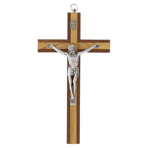 Krucyfiks drewniany, 20 cm, mahoń i drewno oliwne, ciało Chrystusa posrebrzane