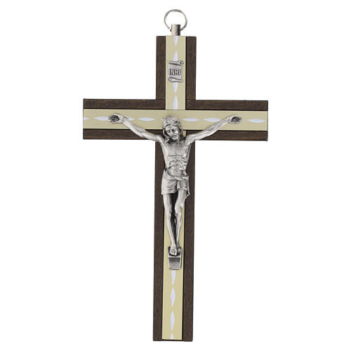 Krucyfiks ścienny wykonany z drewna w ciemnym wybarwieniu, z centralnie umieszczoną postacią Chrystusa odlaną z metalu posrebrzanego (wysokość figurki: 15 cm).