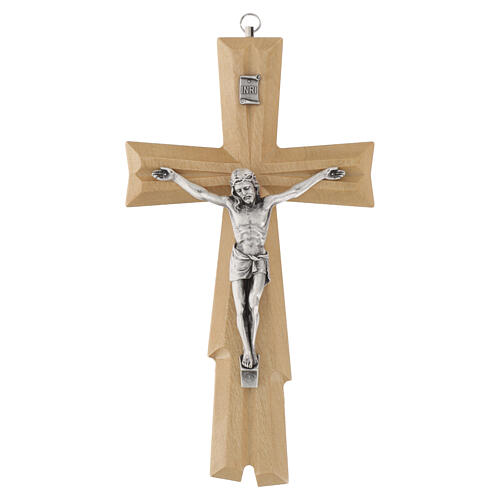 Metalowa figura Chrystusa umieszczona centralnie, z tabliczką INRI przy górnej części krzyża.