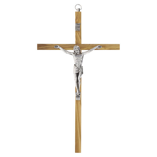 Krucyfiks ścienny z drewna oliwnego z posrebrzanym Chrystusem, 25 cm