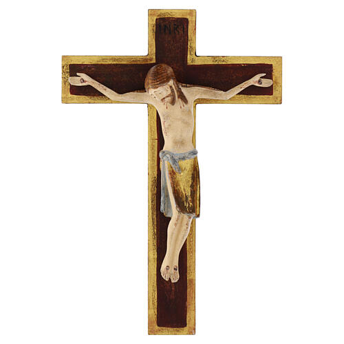 Krucyfiks z drewna klonowego malowanego; wykonany ręcznie przez rzemieślników z Valgardena zgodnie z tradycjami sztuki lokalnej. Produkt wysokiej jakości.