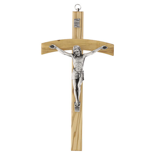 Krucyfiks z drewna oliwnego z łukowatą poprzeczką i postacią metalową, 25 cm.