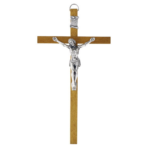 Krzyż ścienny, 30 x 16 cm z jasnego drewna z figurą ze stopu o srebrnym wykończeniu.