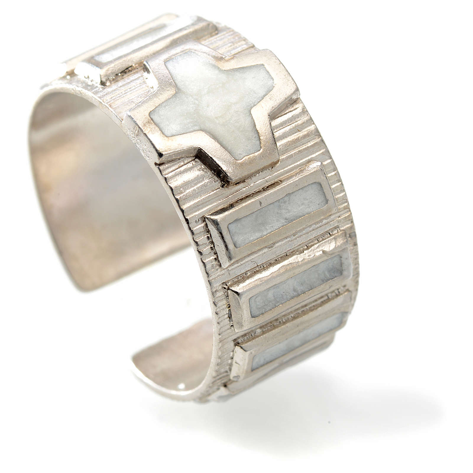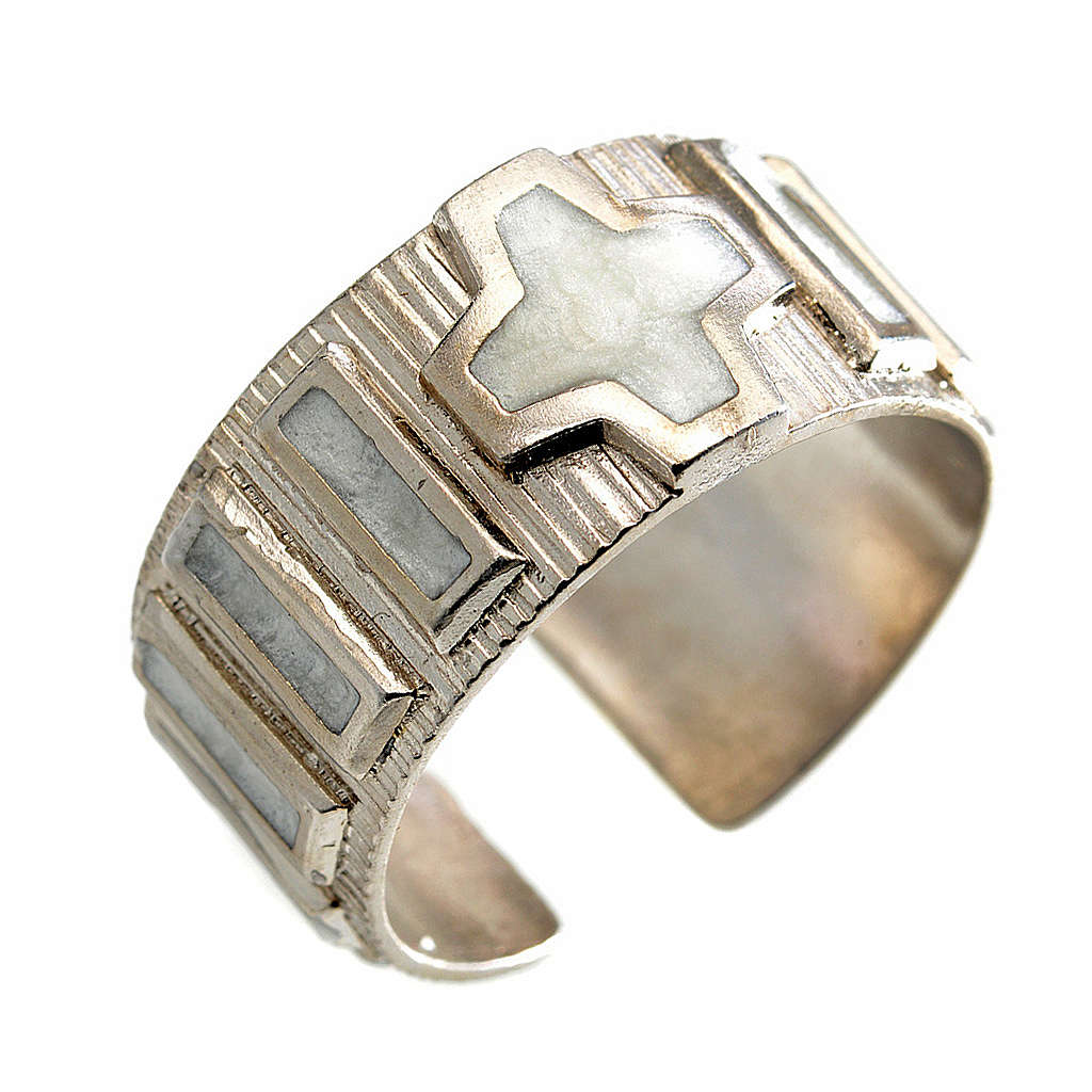 Prosta obrączka dziesiątka różańca do modlitwy zrealizowana ze srebra 925, z dziesiątką i krzyżem z białej emalii. Tylna część obrączki jest otwarta, aby zwiększyć komfort noszenia.