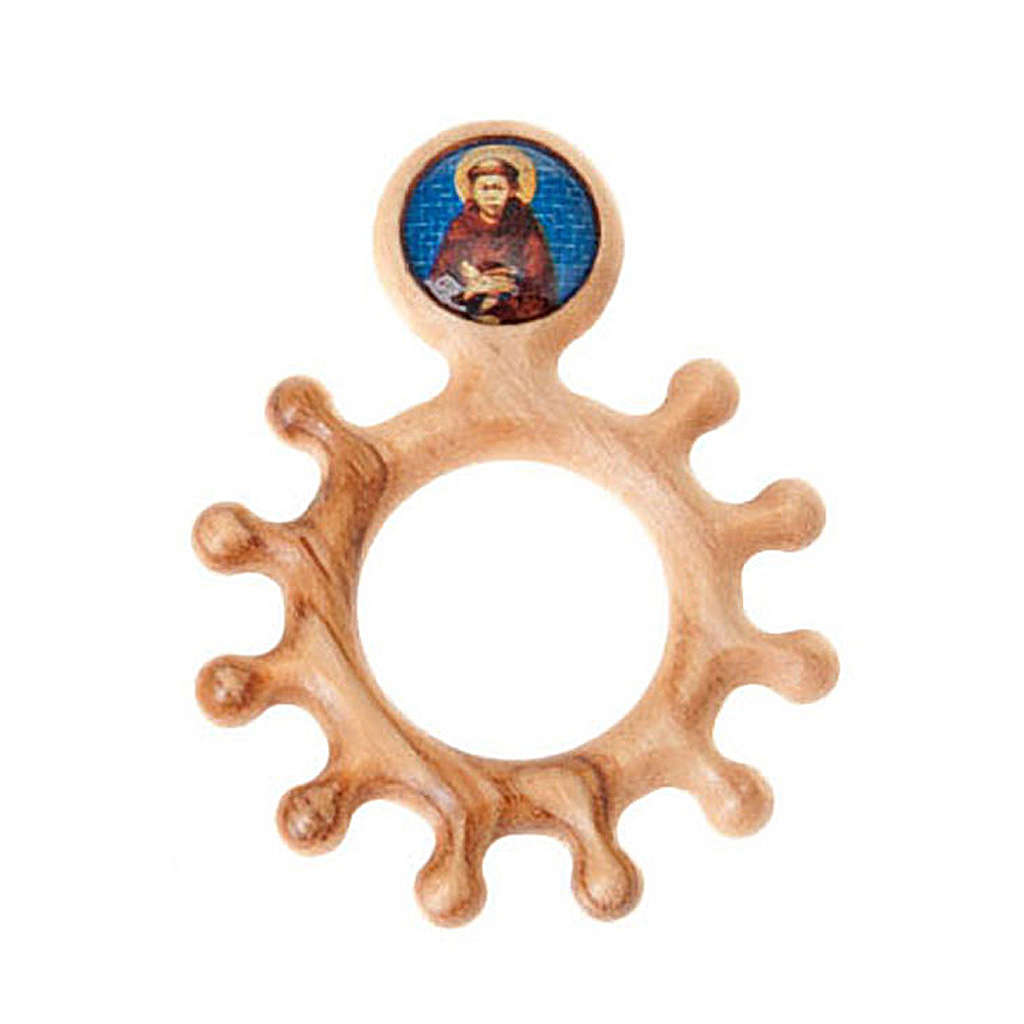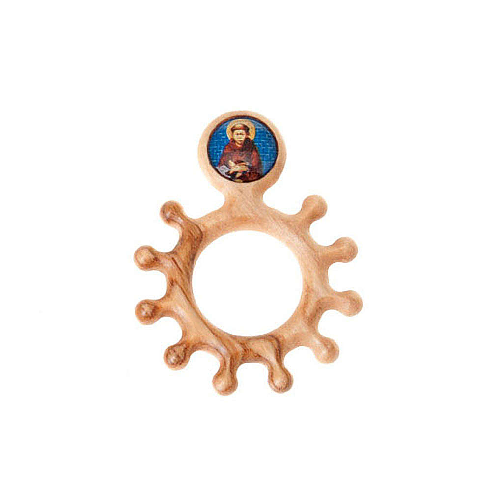 Prosta i skromna obrączka posiada charakterystyczne słoje drewna oliwkowego. Ten różaniec na palec posiada wewnętrzną średnicę 17 mm i żywicowy wizerunek Św. Franciszka.