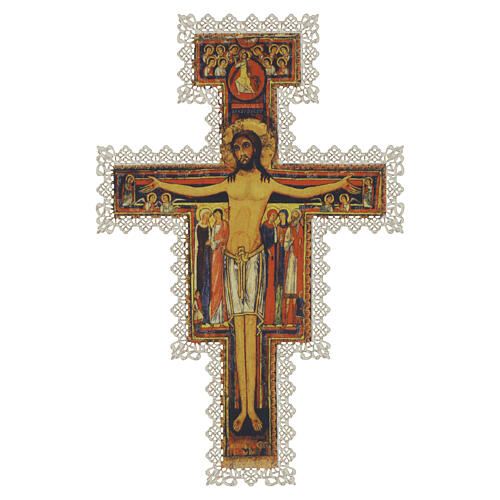 Obrazek religijny — Krzyż Świętego Damiana, 12 x 7 cm, dekoracja koronkowa