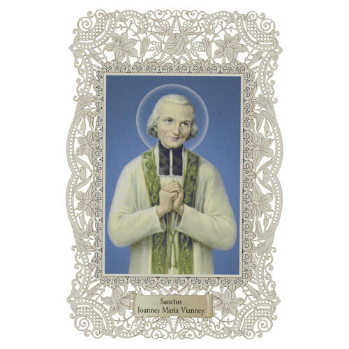 Obrazek religijny - św. Jana Marii Vianney, zielona stuła, 12x7 cm, ozdobna koronkowa ramka