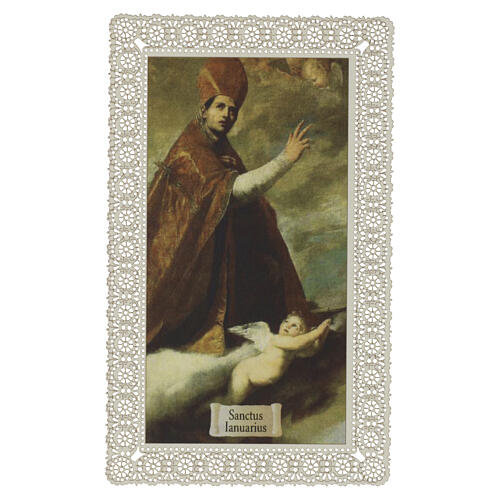 Obrazek św. Januariusza w formacie 12×7 cm. Przedstawia świętego w stroju biskupim: z mitrą i płaszczem liturgicznym, w geście błogosławieństwa i ochrony, przy którym u jego stóp klęczy anioł w modlitwie.