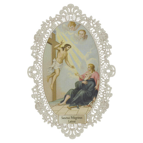Obrazek religijny - św. Peregryn Laziosi z wizją mistyczną, 12×7 cm, koronkowa ramka