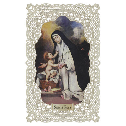 Obrazek religijny - św. Róża z Limy, 12×7 cm, koronkowa ramka.