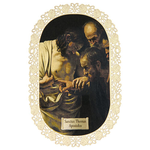 Obrazek religijny — św. Tomasz Apostoł, koronkowe zdobienie, 11 × 7 cm