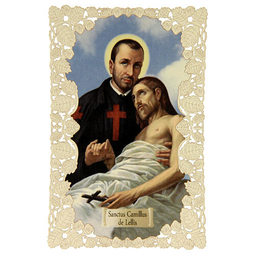 Obrazek religijny - Święty Kamil De Lellis, dekoracja koronkowa, 11x7 cm
