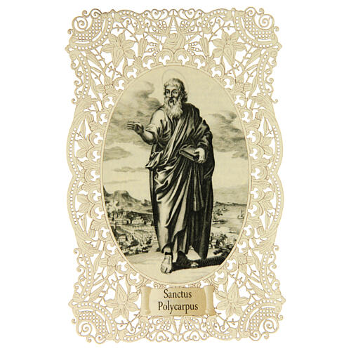 Obrazek św. Polikarpa o wymiarach około 11 x 7 cm, wykonany z wysokogatunkowego papieru z włókien bawełnianych.